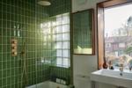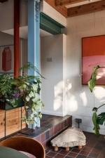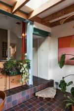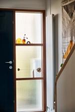 From the kitchen, you step down into the dining area, part of the rear extension. The interior brings together a palette of timber, brick, breeze block and quarry tile, with subtle pops of colour throughout. A large skylight and floor-to-ceiling glazing flood this space with light, while a wall of glass bricks softens it through the day. The garden beyond has been rewilded, providing a natural backdrop and a sense of continuity between inside and out.