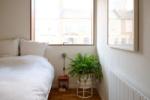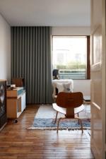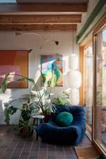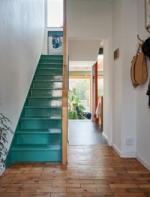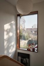 Upstairs are three bedrooms and a family bathroom featuring green tiles and brass fittings. A large window above the stairs draws light deep into the house. The interiors are furnished with a mix of classic mid-century and contemporary pieces.