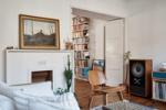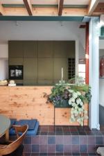 You enter into a hallway with wood-block flooring and decorative glazing reminiscent of the period. To the right is the living room — a calm, light-filled space where the wood-block flooring continues underfoot. Folding doors connects this to the kitchen, fitted with bespoke olive-green cabinetry.