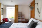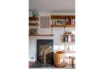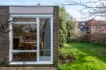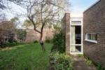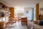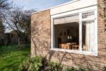 Upon entering, a hallway leads to a generously sized open-plan living room filled with natural light that floods the space through expansive windows, highlighting the original shelving, the fireplace and Holst's writing desk. An angled skylight brings daylight into the centre of the house. Off the living room is a soundproofed music room — concerned not to disturb her neighbours with her passion for listening to Indian music. The double bedroom has a king-size bed, an original Anglepoise wall lamp and shelving. There is a compact yet well-equipped kitchen with a built-in table, designed by Cadbury-Brown for Holst, with views of the charming garden. The contemporary bathroom boasts a modern shower. Outside, the wrap-around garden invites moments of relaxation amidst nature.