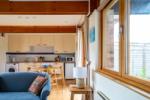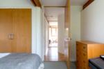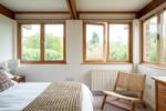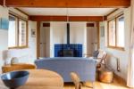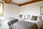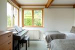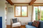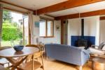 The property exudes a secluded ambience, and is accessed through the Red House garden. Inside, there is a modest hall that opens up to an airy, open-plan living space and kitchen with abundant natural light. The living area is furnished with comfortable seating arranged around a curved fireplace. Adjacent to the living area is a compact, but fully equipped kitchen with a dining table and seating for four. French doors on either side provide access to an enclosed garden surrounding the bungalow. Flanking the hallway are two large pivot doors that lead to the two double bedrooms. One bedroom features a king-sized bed, chest of drawers, and built-in wardrobe, while the second bedroom offers twin beds that can be converted into a super king upon request. Both bedrooms have large windows overlooking the lush surroundings. The accommodation is completed by a well-appointed bathroom with a shower, toilet, and hand basin. This delightful property is perfect for couples or small families looking for a tranquil retreat in the picturesque setting of The Red House garden.