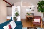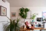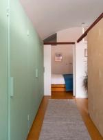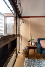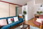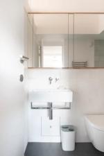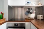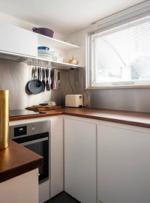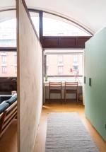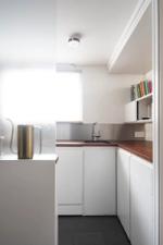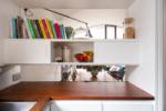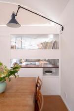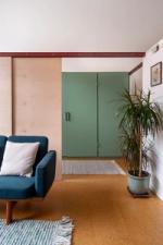 The living space offers ample room for a dining table and sofa, with original built-in bookshelves under the windows. A three-quarter-height partition (with integral uplighters) and sliding doors separate the sleeping area. Additionally, the owners have ingeniously installed plywood sliding doors to create a study nook. Cork flooring with underfloor heating runs throughout.