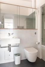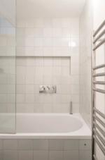Entered on the third floor, it opens into a compact lobby. To the left is a modern fitted kitchen with a restored wood worktop and a partly glazed screen separating the kitchen and dining area — incorporating a serving hatch and storage. To the right of the hall is a contemporary bathroom with a shower, bath and concealed storage.