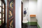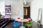 A spacious split-level apartment located in a Grade II-listed historic building in East London, where the early Modern Movement meets bohemian chic. This late 19th-century red brick building was originally built as the Mansfield House University Settlement. It was extended and refurbished by George Grey Wornum in the 1930s, including the stunning communal spiral staircase and terrazzo flooring. The apartment served as the building's cafeteria, designed by Wornum, and retains many original features, such as restored panel paintings by the talented designer and painter Miriam Wornum and 16-foot vaulted ceilings. Upon entering the apartment, guests are greeted by a compact hall that offers a practical space for storing coats and shoes. Passing through the original double doors, one is led down to a large open-plan dining area with a modern fitted kitchen at its far end. Ascending to the upper level is a thoughtfully arranged layout with distinct zones for sleeping, lounging, or working. Original floor-to-ceiling Crittall windows flood the space with natural light, and a modern bathroom, equipped with both a bath and a shower, adds a touch of contemporary convenience. The apartment's stylish interior is furnished with an eclectic mix of modern design classics such as Vitsoe shelving and Eames chairs. Whether you're a writer or designer, or simply need a serene retreat to read and think, this apartment offers a creative and peaceful oasis.
