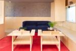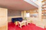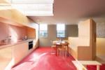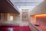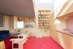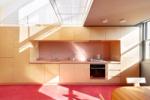 Upstairs, the first floor boasts an open-plan living room and kitchen with integrated modern appliances. The dual-aspect space seamlessly connects areas for working, cooking, dining, and relaxing, offering flexibility for contemporary living. Red pigmented concrete floors contrast beautifully with bespoke birch joinery and custom-built furniture throughout.
