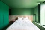 On the ground floor, you’ll find two double en-suite bedrooms and a storage room. The master bedroom showcases a striking green palette, with concrete floors and wainscoting. Its en-suite bathroom includes a walk-in shower, a pink wall-mounted basin, and elegant gold fixtures. The second bedroom offers a bold design in white and burnt-orange, complete with a fitted bath and geometric tiles.