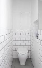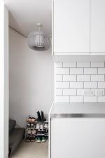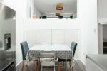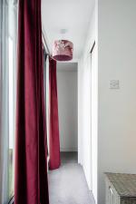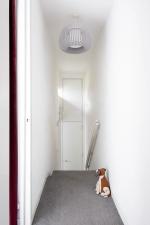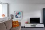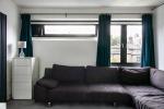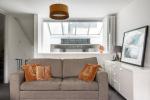 A half-flight of stairs leads to the south-facing living space, where a sliding partition conceals generous built-in storage and allows the area to be opened up or divided as needed. A WC is also on this level.