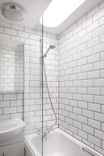 Occupying the upper levels of the building, the flat is entered from a raised deck with its own private front door — a hallmark of ‘Cook’s Camden’. The entrance corridor leads to a fitted kitchen with space for dining and a skylight that draws light into the centre of the plan, typical of Benson & Forsyth’s work.