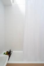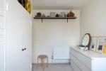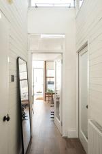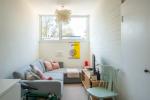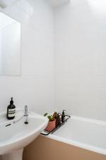 Beyond the living room, a double-height corridor leads to the rest of the flat. To the left is the kitchen and the second bedroom, which includes fitted storage and is currently used as a snug—equally suitable as a study or guest room. Straight ahead is the main bedroom, a good-sized room with an original fitted wardrobe. To the right is the bathroom, which retains its original basin and has a shower-over-bath, lit from above by a skylight.