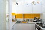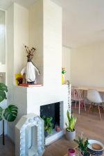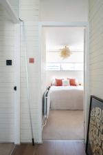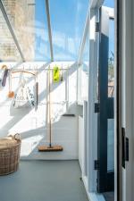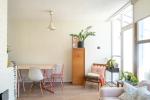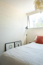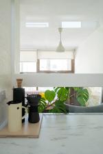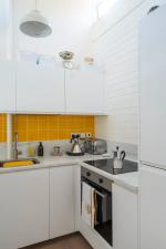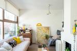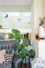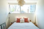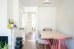Entry is via a communal access deck that also functions as a balcony, with space for plants and seating—ideal for a morning coffee. A fully-glazed porch opens into the flat, leading directly into the main living area. The open-plan living and dining space is generous in size, with timber flooring and full-height glazing along one wall that looks out onto the balcony. An original glazed hatch connects through to the kitchen, which benefits from a double-height ceiling and skylight above. The kitchen is modern and well-equipped, with a marble worktop, oven, hob, fridge, freezer and washing machine.